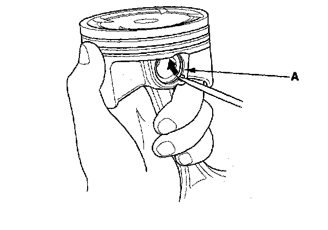 3. Remove both snap rings (A). Start at the cutout in the piston pin bore. Remove the snap rings carefully so they do not go flying or get lost. Wear eye protection.