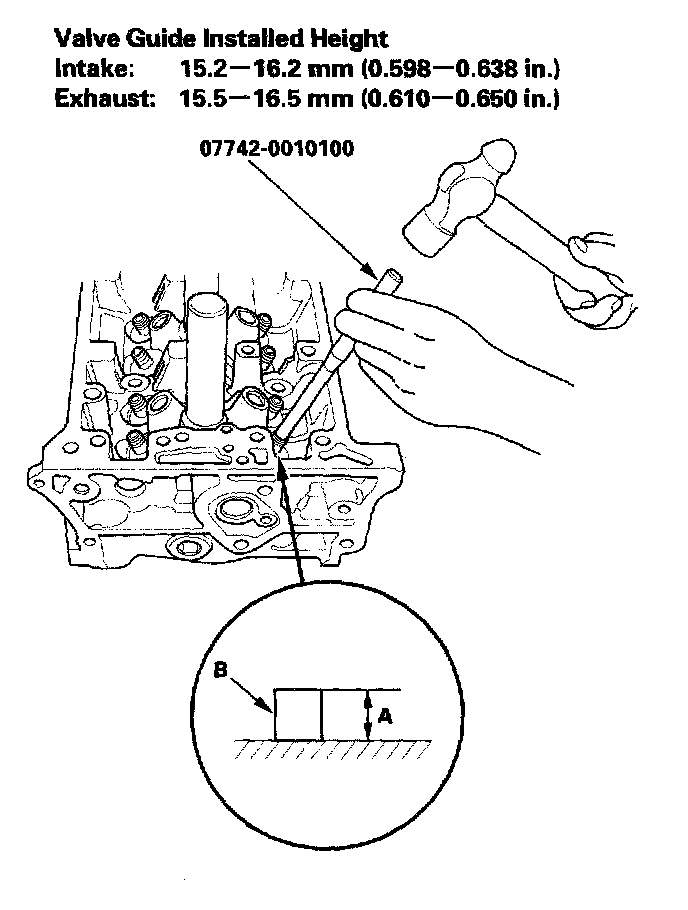 9. Apply a thin coat of clean engine oil to the outside of the new valve guide. Install the guide from the camshaft side of the head; use the special tool to drive the guide in to the specified installed height (A) of the guide (B). If you have all 16 guides to do, you may have to reheat the head.