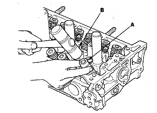 2. Using an appropriate-sized socket (A) and plastic mallet (B), lightly tap the valve retainer to loosen the valve cotters.