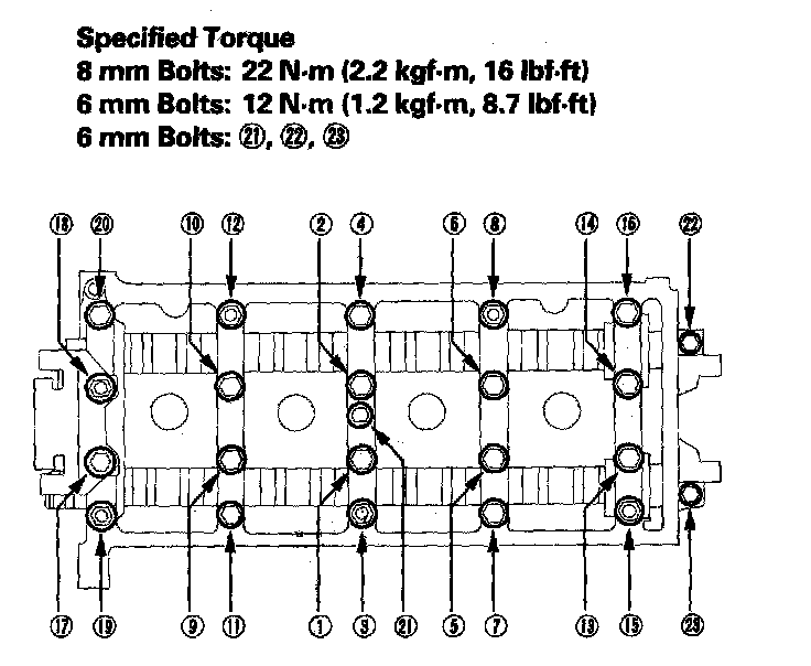 2. Put the rocker shaft holders, camshaft, and camshaft holders on the cylinder head, then tighten the bolts in sequence to the specified torque.