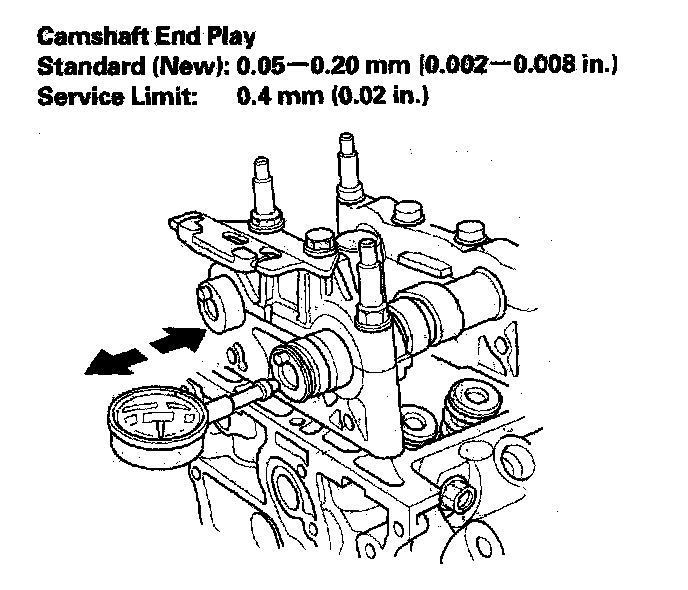 4. Zero the dial indicator against the end of the camshaft, then push the camshaft back and forth and read the end play. If the end play is beyond the service limit, replace the cylinder head and recheck. If it is still beyond the service limit, replace the camshaft.