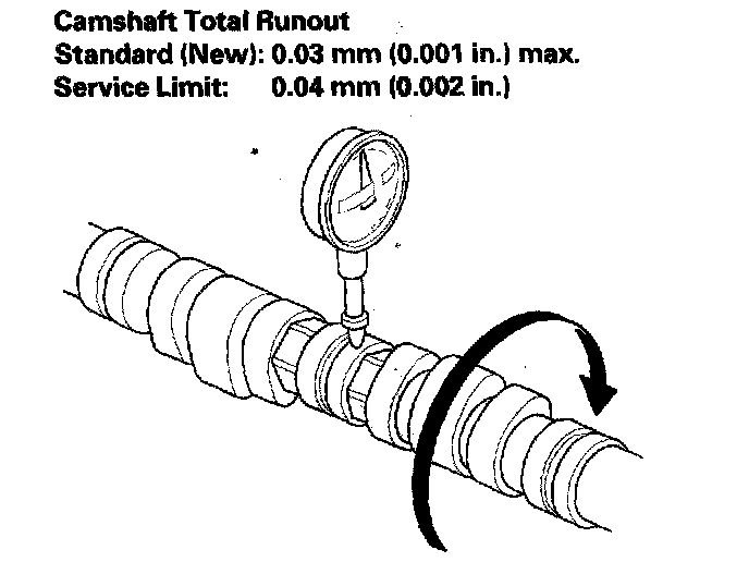 ^ If the total runout is beyond the service limit, replace the camshaft and recheck the camshaft-to-holder oil clearance. If the oil clearance is still beyond the service limit, replace the cylinder head.