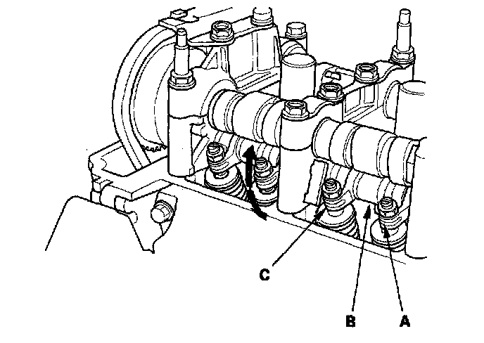 9. Remove the No. 2 and No. 3 camshaft holder bolts, and install the VTEC air adapters (C) finger-tight.