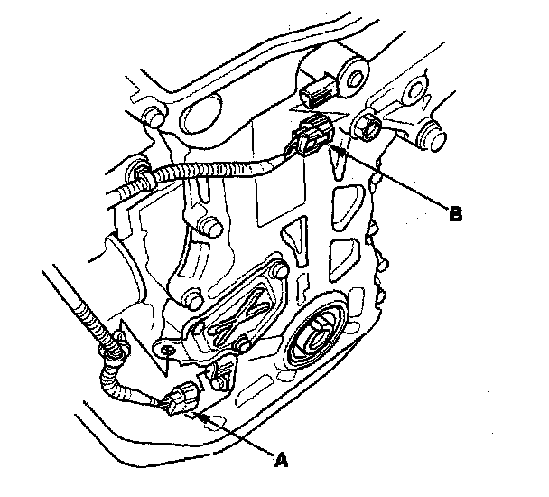 8. Disconnect the crankshaft position (CKP) sensor connector (A) and variable valve timing control (VTC) oil control solenoid valve connector (B).