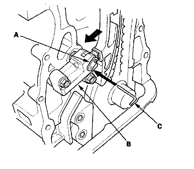 16. Align the holes on the lock (A) and the auto-tensioner (B), then insert a 1.2 mm (0.05 inch) diameter pin or lock pin (P/N 14511-PNA-003) (C) into the holes. Turn the crankshaft clockwise to secure the pin.