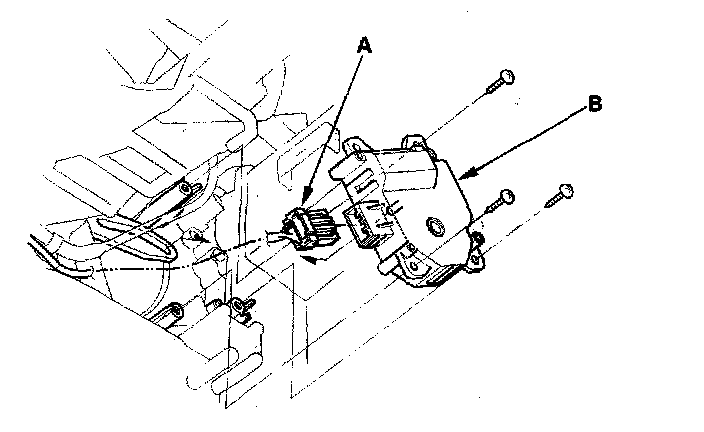 Passenger's Air Mix Control Motor Replacement1. Disconnect the 7P connector (A) from the passenger's air mix control motor (B). Remove the self-tapping screws and the passenger's air mix control motor from the heater unit.