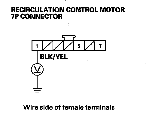 4. Measure the voltage between the No. 1 terminal of the recirculation control motor 7P connector and body ground.