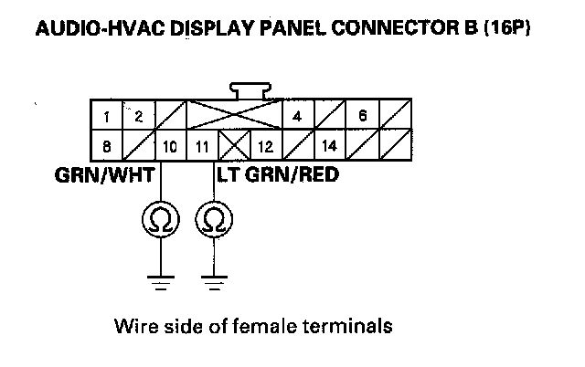 8. Check for continuity between the No. 10 and No. 11 terminals of audio-HVAC display panel connector B (16P) and body ground individually.