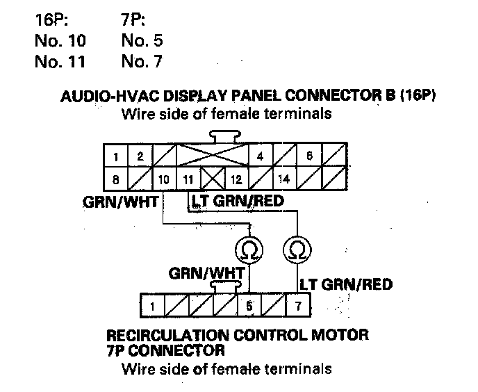 11. Check for continuity between the following terminals of audio-HVAC display panel connector B (16P) and the recirculation control motor 7P connector.