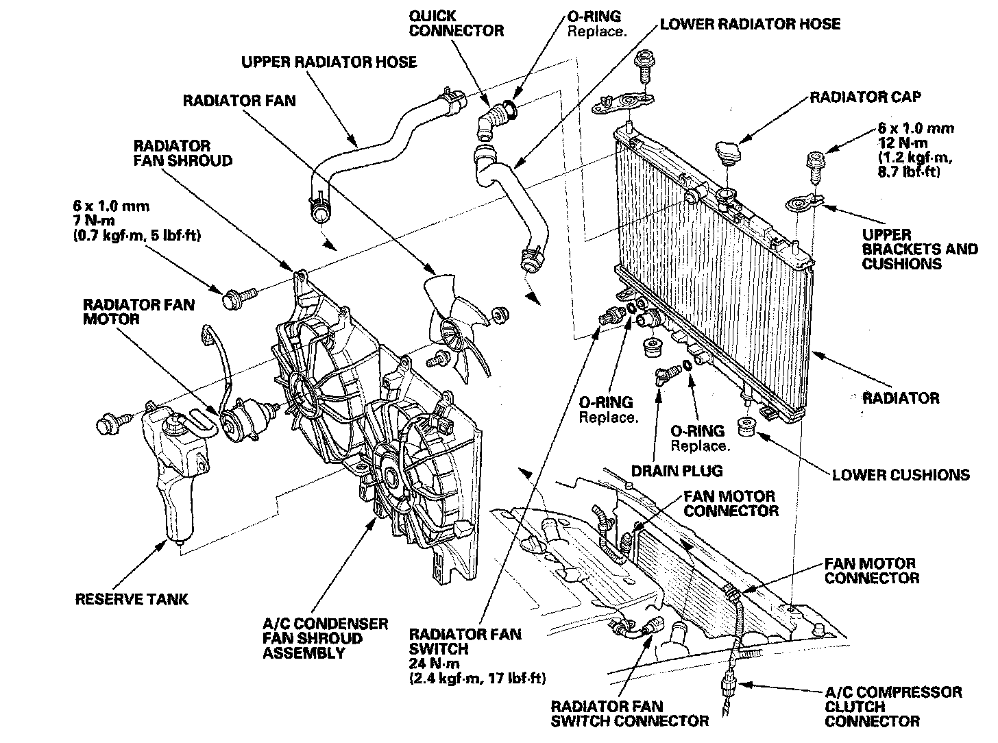 5. Disconnect the fan motor connectors, radiator fan switch connector, and A/C compressor clutch connector.
