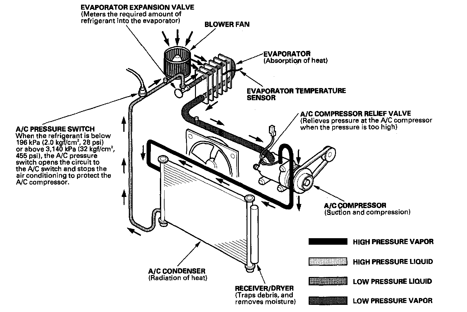 System DescriptionThe air conditioning system removes heat from the passenger compartment by circulating refrigerant through the system.