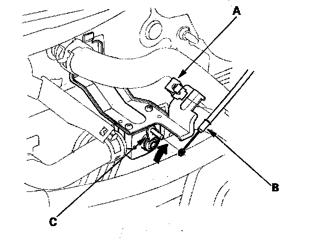 Heater Valve Cable Adjustment1. From under the hood, open the cable clamp (A), then disconnect the heater valve cable (B) from the heater valve arm (C).