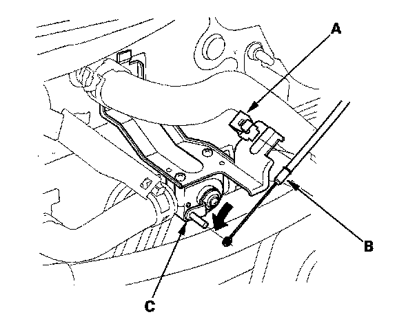 4. From under the hood, open the cable clamp (A), then disconnect the heater valve cable (B) from the heater valve arm (C). Turn the heater valve arm to the fully opened position as shown.