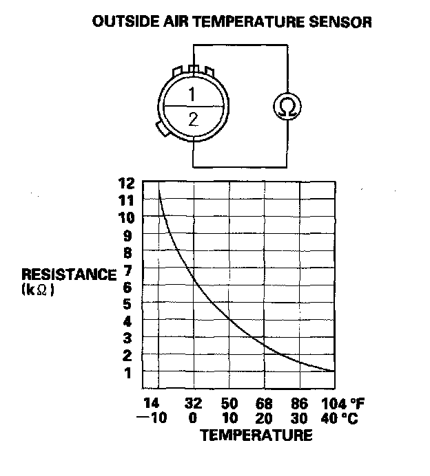 Compare the resistance reading between the No. 1 and No. 2 terminals of the outside air temperature sensor with the specifications shown in the graph; the resistance should be within the specifications.