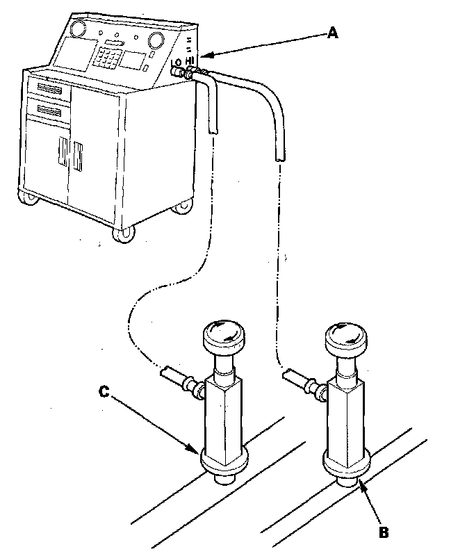 1. Connect art R-134a refrigerant recovery/recycling/charging station (A).to the high-pressure service port (B) and the low-pressure service port (C), as shown, following the equipment manufacturer's instructions.
