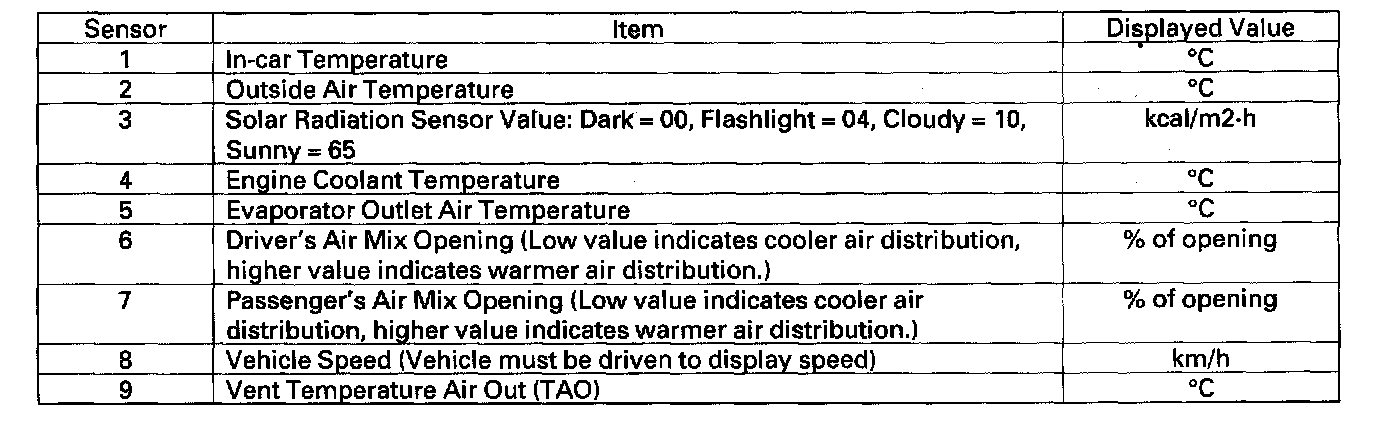 Displaying Sensor Inputs at the Climate Control UnitThe climate control unit has a mode that displays sensor inputs it receives. This mode shows you what the climate control unit is receiving from each of the sensors, one at a time, and it can help you determine if a sensor is faulty.