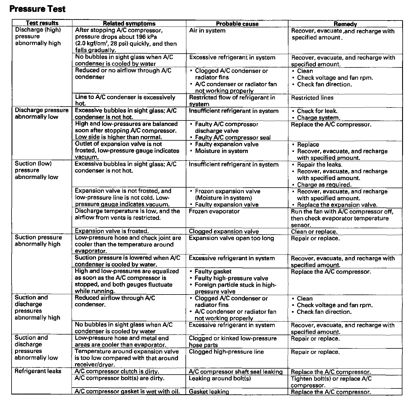 R-134a service equipment or vehicle air conditioning systems should not be pressure tested or leak tested with compressed air.