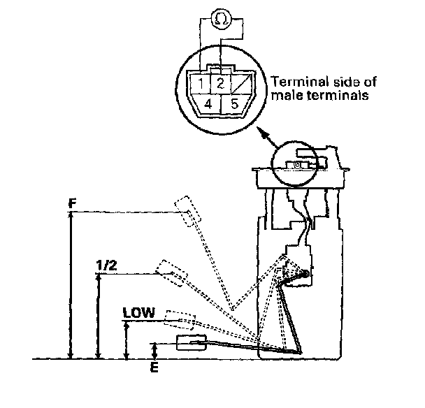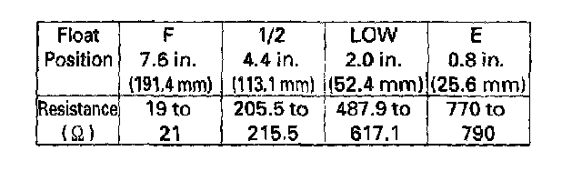 9. Measure resistance between the No. 1 and No. 2 terminals with the float at E (EMPTY), 1/2 (HALF FULL), and F (FULL) positions. If you do not get the following readings, replace the fuel gauge sending unit.