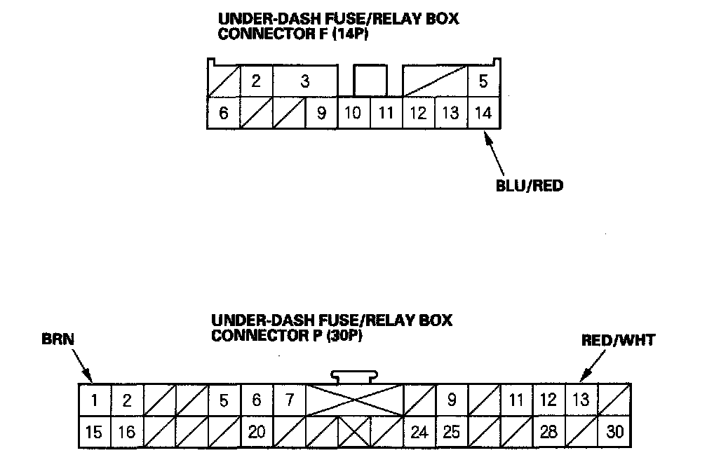 3. Disconnect the under-dash fuse/relay box connectors F, H and P.