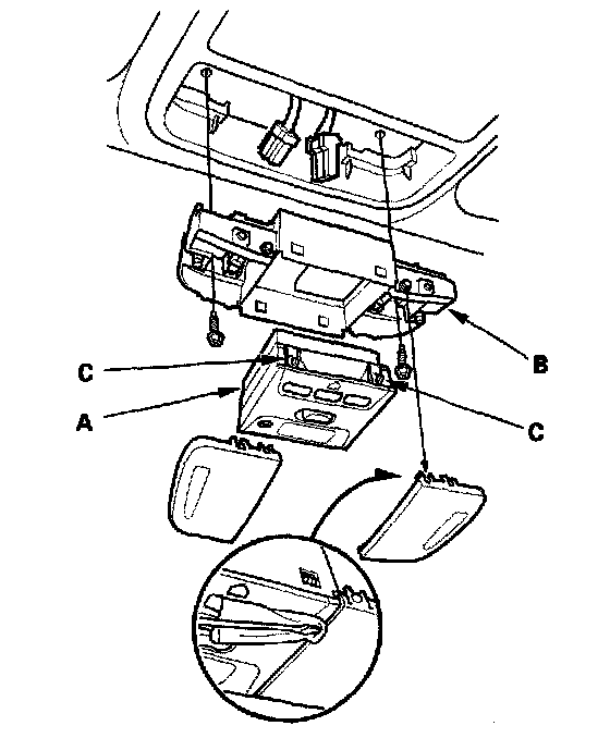 2. Carefully pry off the ambient light assembly (A) from the map light housing (B) while pressing in on the retaining tabs (C).