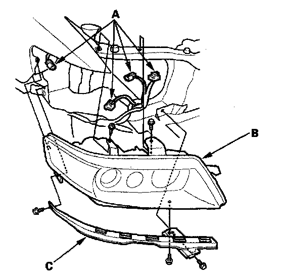 4. Remove the bolt and the corner upper beam (C) from the head light.