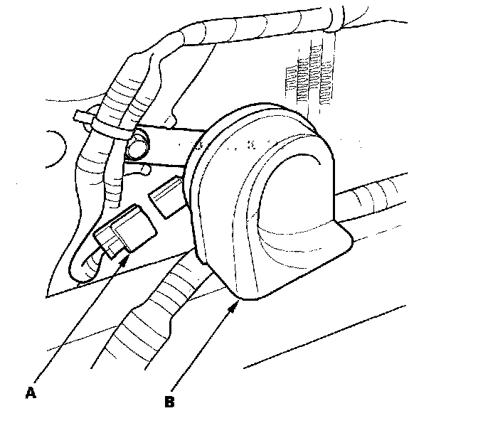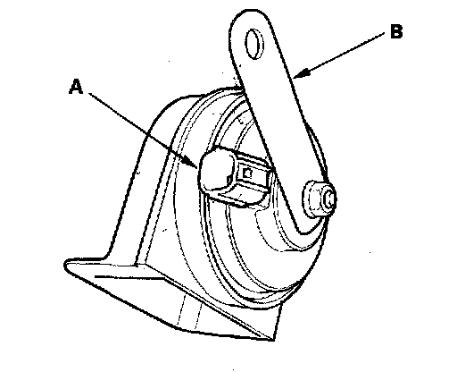 3. Test the horn by connecting battery power to the terminal (A) and grounding the bracket (B). The horn should sound.
