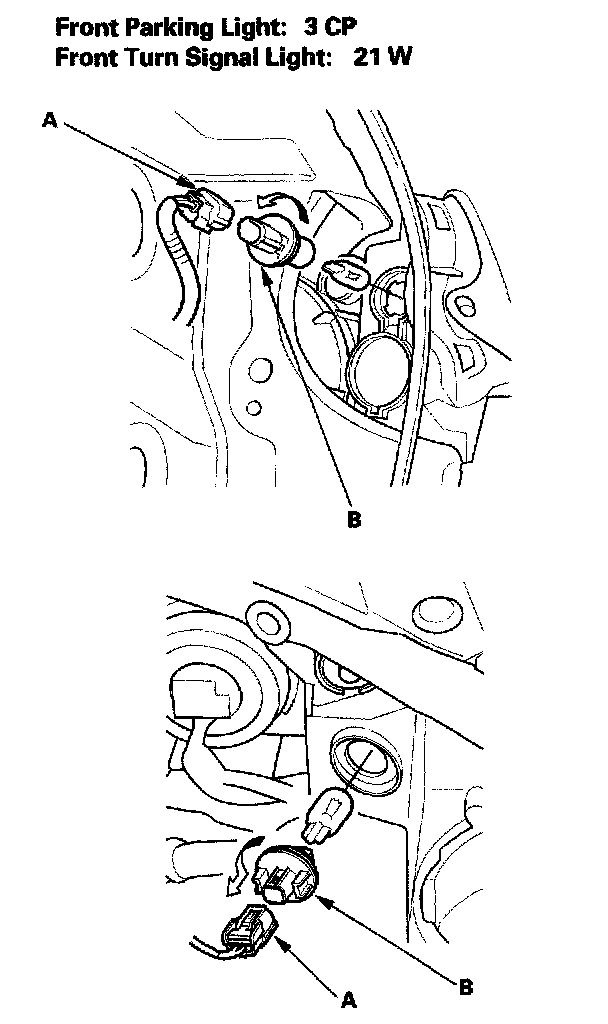 2. Turn the bulb socket (B) 45 ° counterclockwise to remove it from the headlight housing.