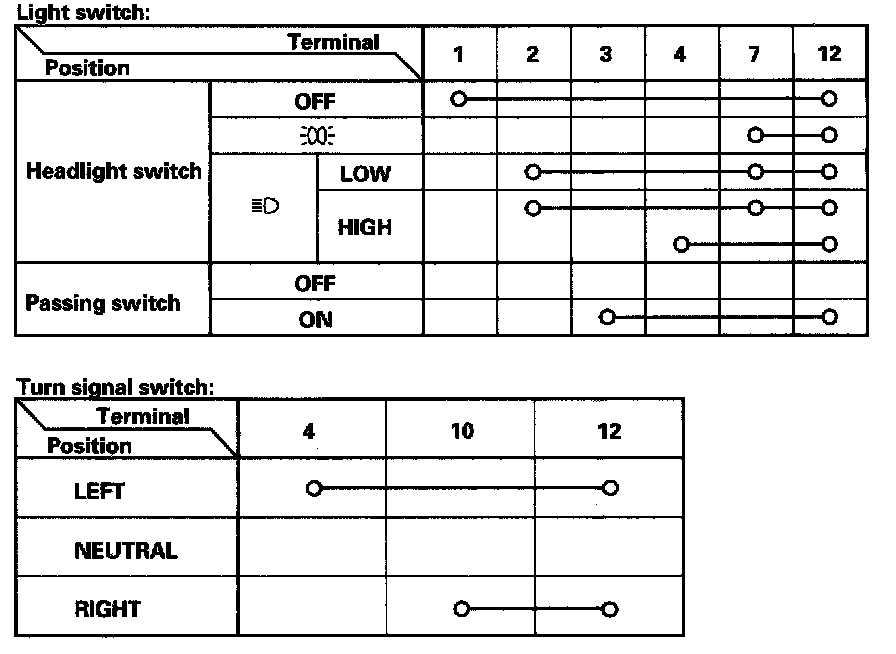 - If the terminals look OK, check for continuity between the terminals in each switch position according to the tables.