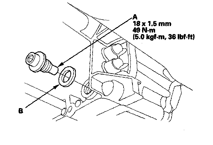 3. Remove the drain plug (A), and drain the automatic transmission fluid (ATF). Then reinstall the drain plug with a new sealing washer (B).
