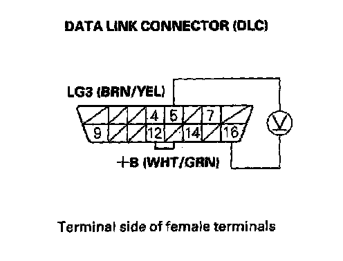 3. Measure voltage between DLC terminals No. 5 and No.16.