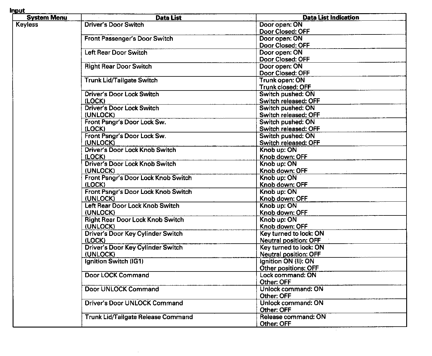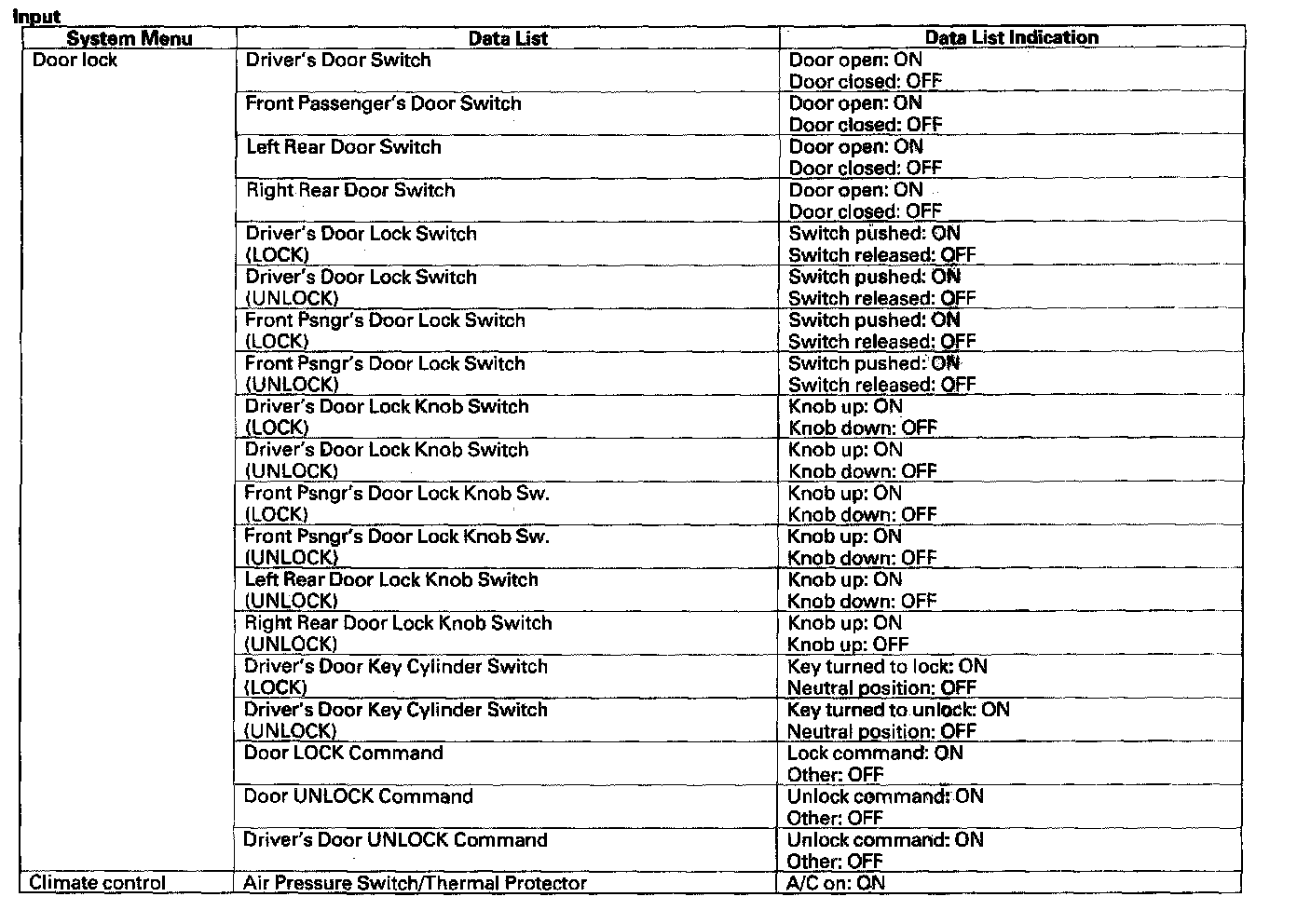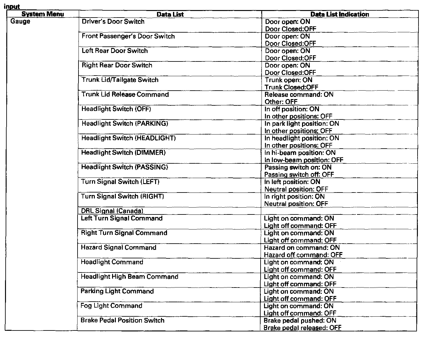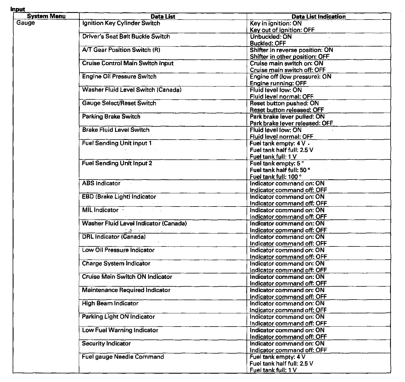 Pinout Values and Diagnostic Parameters