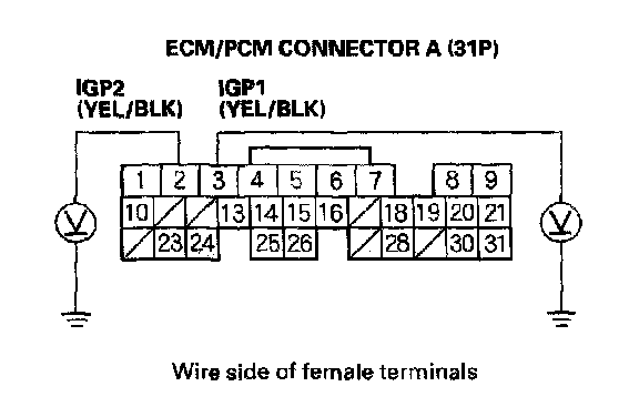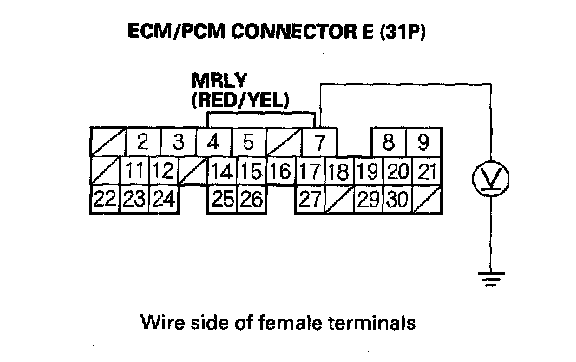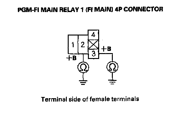 27. Check for continuity between body ground and PGM-FI main relay 1 (FI MAIN) 4P connector terminals No. 2 and No. 3 individually.