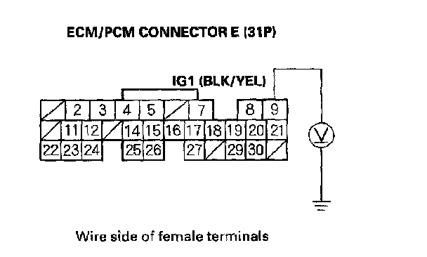 47. Measure voltage between ECM/PCM connector terminal E9 and body ground.