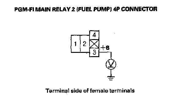 59. Measure voltage between PGM-FI main relay 1 (FI MAIN) 4P connector terminal No. 2 and body ground.