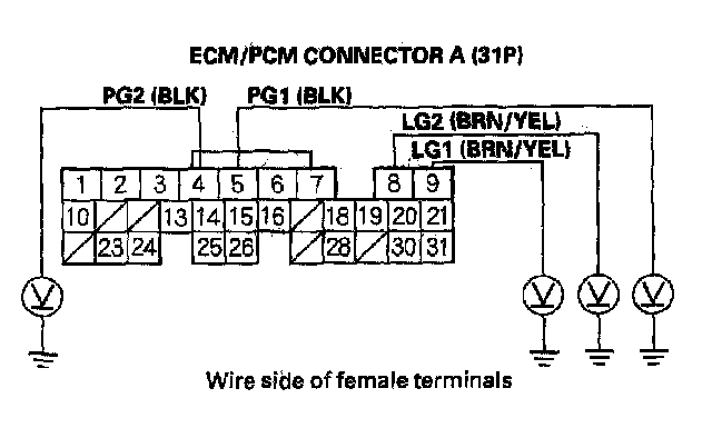 62. Measure voltage between body ground and ECM/PCM connector terminals A4, A5, A8, and A9 individually.