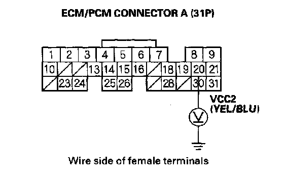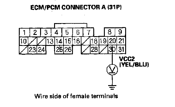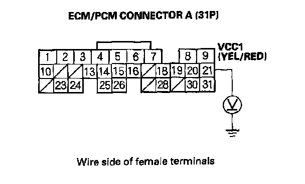 65. Disconnect the connector from each of these sensors, one at a time, and measure voltage between body ground and ECM/PCM connector terminal A21 with the ignition switch ON (II).