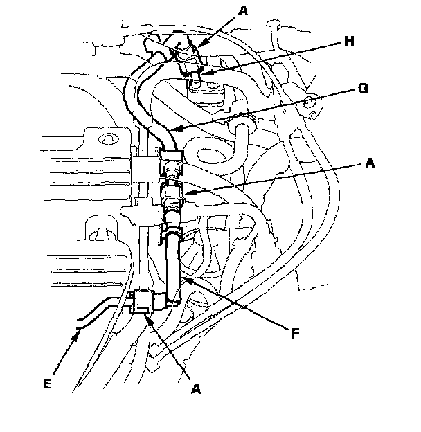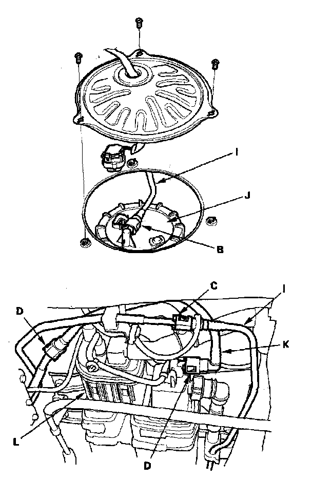 Fuel Line/Quick-Connect Fitting PrecautionThe fuel line/quick-connect fittings (A), (B), (C), (D) connect the fuel rail (E) to fuel feed hose (F), fuel feed hose to the fuel feed hose (G), the fuel feed hose to the fuel line (H), the fuel line (I) to the fuel tank unit (J) and the fuel vapor line (K) to the EVAP canister (L). When removing or installing the fuel feed hose, fuel tank unit, or fuel tank, it is necessary to disconnect or connect the quick-connect fittings.