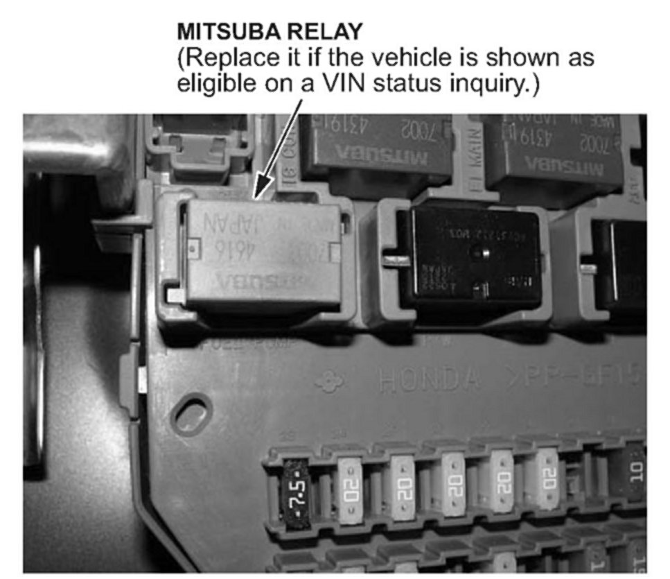 ^ If the name on the relay is MITSUBA, and the vehicle is shown as eligible on a VIN status inquiry, replace the relay.