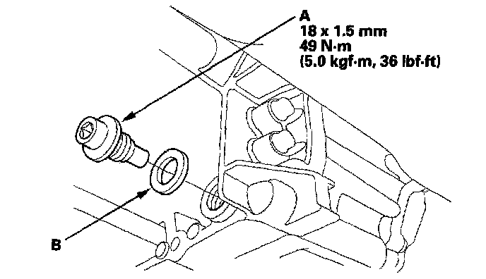6. Remove the drain plug (A), and drain the automatic transmission fluid (ATF). Then reinstall the drain plug with a new sealing washer (B).