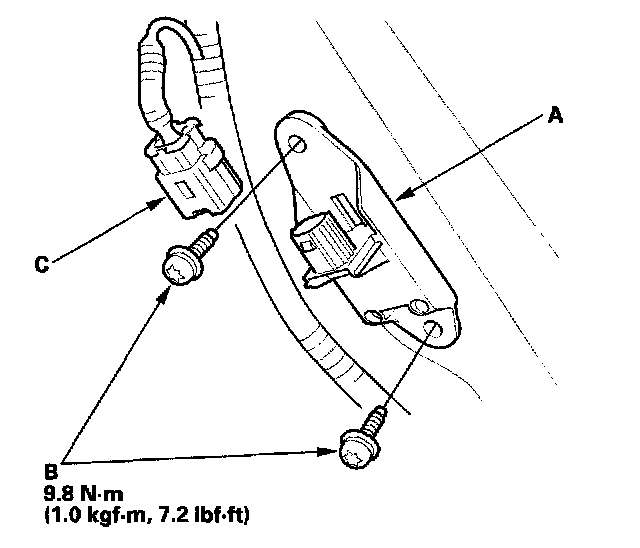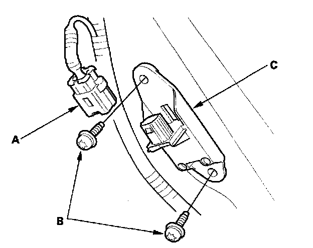1. Install the new side impact sensor (second) (A) with the Torx bolts (B) then connect the side curtain airbag subharness 2P connector (C) to the side impact sensor (second).