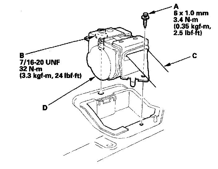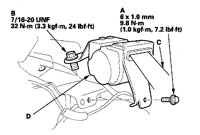 4. Remove the retractor mounting self-tapping ET screw (A) and the retractor bolt (B), then remove the center seat belt (C) and retractor (D).
