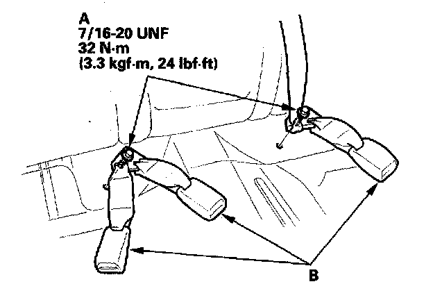 2. Remove the center anchor bolts (A), and remove the seat belt buckles (B).