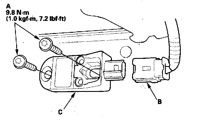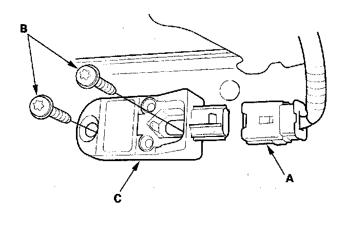 1. Install the new front impact sensor with new Torx bolts (A), then connect the engine compartment wire harness 2P connector (B) to the front impact sensor (C).