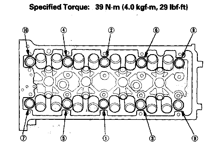 Cylinder headTighten the cylinder head bolts in sequence to 39 Nm (4.0 kgf-m, 29 ft. lbs.). Use a beam-type torque wrench. When using a preset-type torque wrench, be sure to tighten slowly and do not overtighten. If a bolt makes any noise while you are torquing it, loosen the bolt and retighten it from the first step.