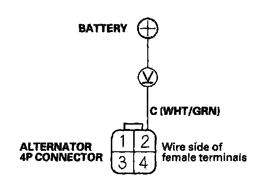 5. Measure the voltage between alternator 4P connector terminal No. 2 and the positive terminal of the battery.