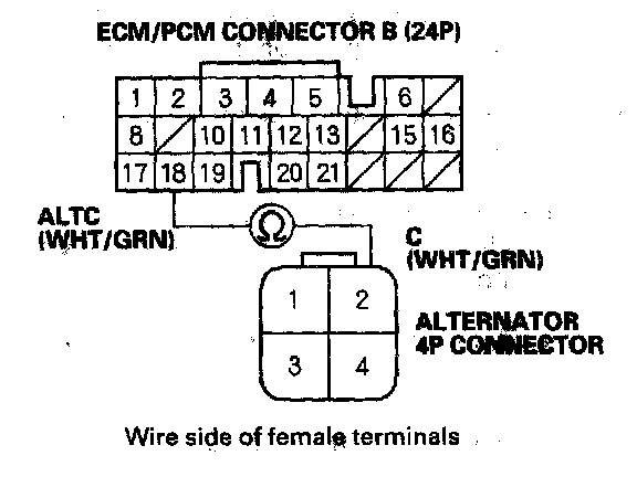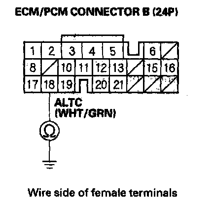 11. Check for continuity between ECM/PCM connector terminal B18 and alternator 4P connector terminal No. 2.