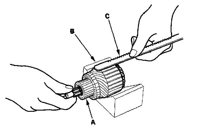 9. Place the armature (A) on an armature tester (B). Hold a hacksaw blade (C) on the armature core. If the blade is attracted to the core or vibrates while the core is turned, the armature is shorted. Replace the armature.