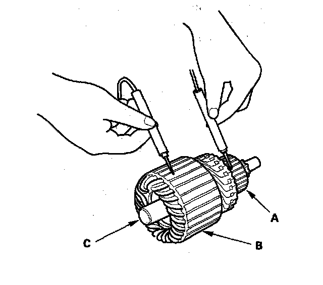 10. Check with an ohmmeter for continuity between the commutator (A) and armature coil core (B), and between the commutator and armature shaft (C). If there is continuity, replace the armature.