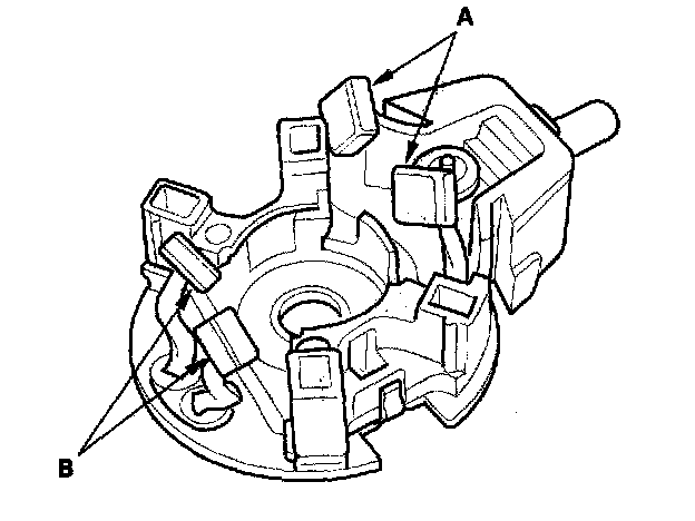 12. Check for continuity between the (+) brush (A) and (-) brush (B). If there is continuity, replace the brush holder assembly.
