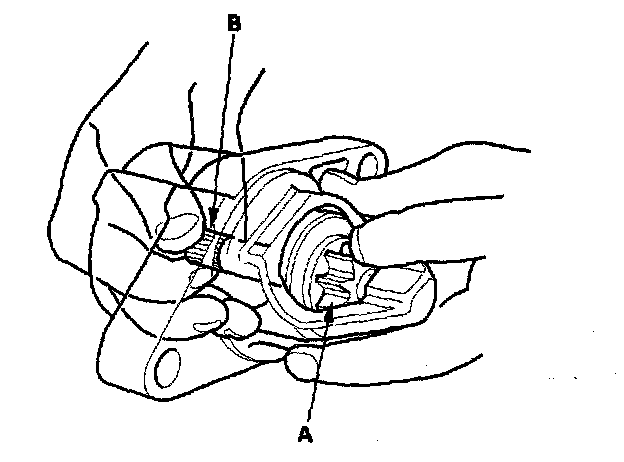 14. While holding the drive gear (A), turn the gear shaft (B) clockwise. Check that the drive gear comes out to the other end. If the drive gear does not move smoothly, replace the gear cover assembly.